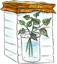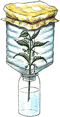 Cut around the base of the bottle about 4 cm from the bottom. Remove the off-cut. (This makes a useful tray for plant pots). Remove the lid from the bottle and insert the neck into the jar. (It should fit snugly). If it is loose bind the necks together with some sellotape or insulating tape. Stand the jar on a table and half-fill with water. Place chosen leaves or plants in the jar of water. Pack cotton wool around the top of the jar. This will prevent caterpillars from falling into the water. Cut out a piece of muslin to fit around the open end of the bottle and secure the muslin with the elastic band.